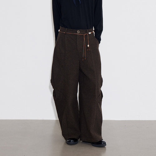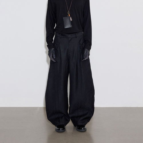 3D Pleated Wide-Leg Pants, Subtle Pattern Fabric, Beaded Design, Avant-Garde Curved-Leg Pants