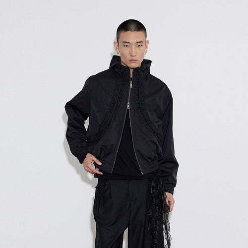 Hooded Zip Cardigan-Style Jacket with Paneled Ruches, Loose-Fit Cropped Outerwear