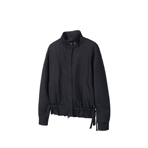 Three-Color Stand-Collar Jacket, Hem-with-Drawstring Blended Top Coat