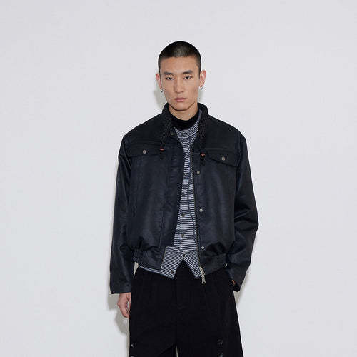 Knitted Collar Moto Leather Jacket, Washed Moto Stand-Collar Jacket Top