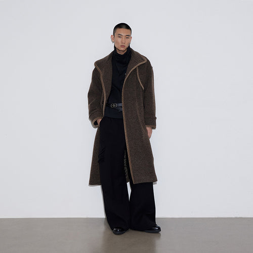 Retro Brown Wool Coat, Textured Spine-Collar Long-Length Outerwear (Unisex) for Winter