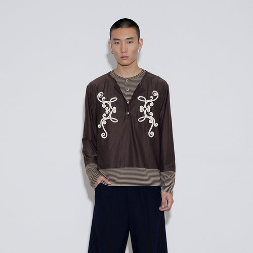 Mao Su V-neck badge shirt with patchwork collar and long sleeves